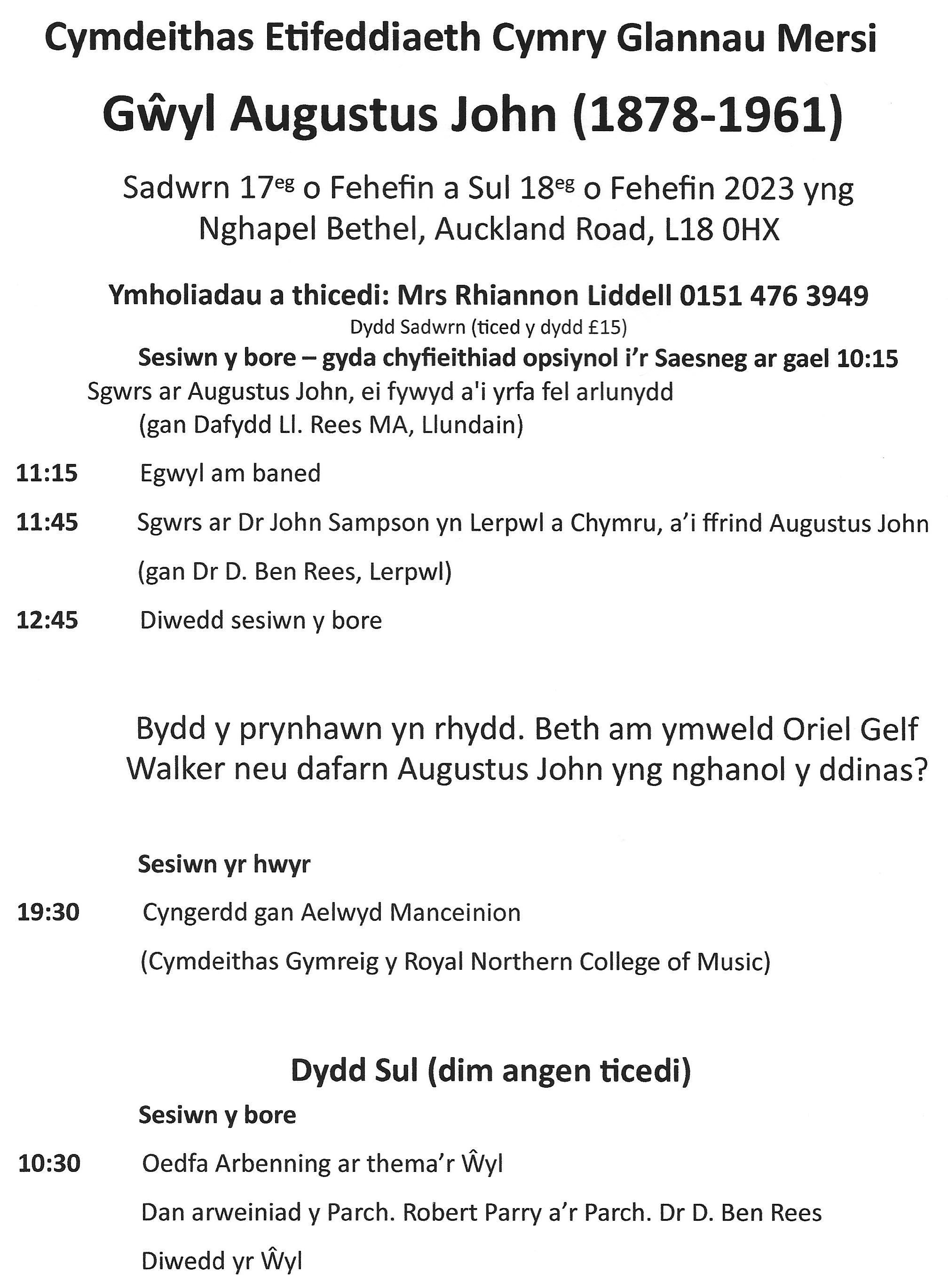 Sesiwn y Bore, yng Nghanolfan Cymry Lerpwl, Capel Bethel,