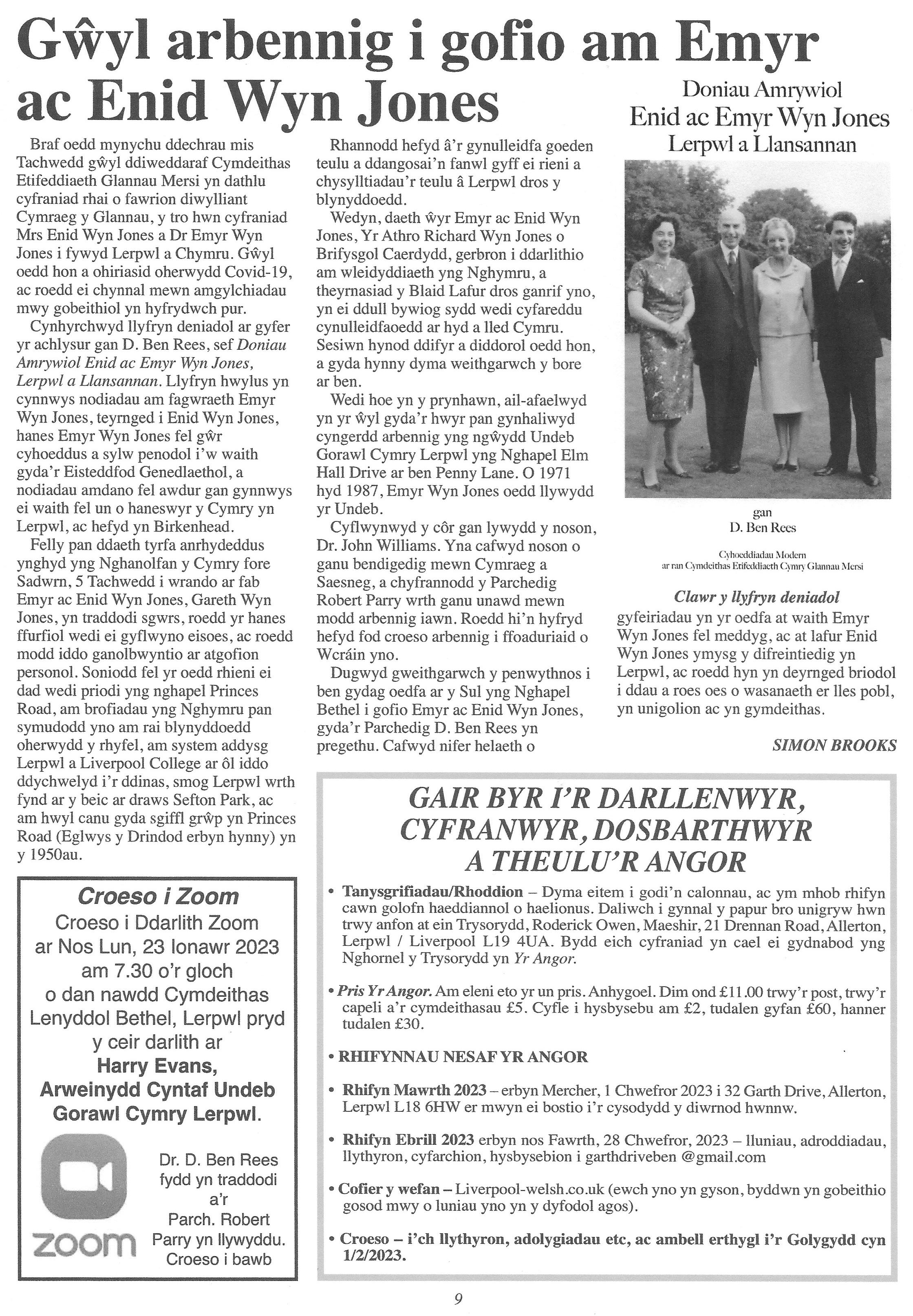 Cyfraniad Mrs Enid Wyn Jones & Dr Emyr Wyn Jones